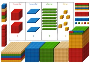 Die perspektivischen Dienes-Blöcke sind ideal, wenn ihr möglichst realistische Blöcke wollt und die Stellen des Zehnersystems ganz klar getrennt halten wollt. Ein typisches Beispiel wären die in Spalten sortierten Blöcke: