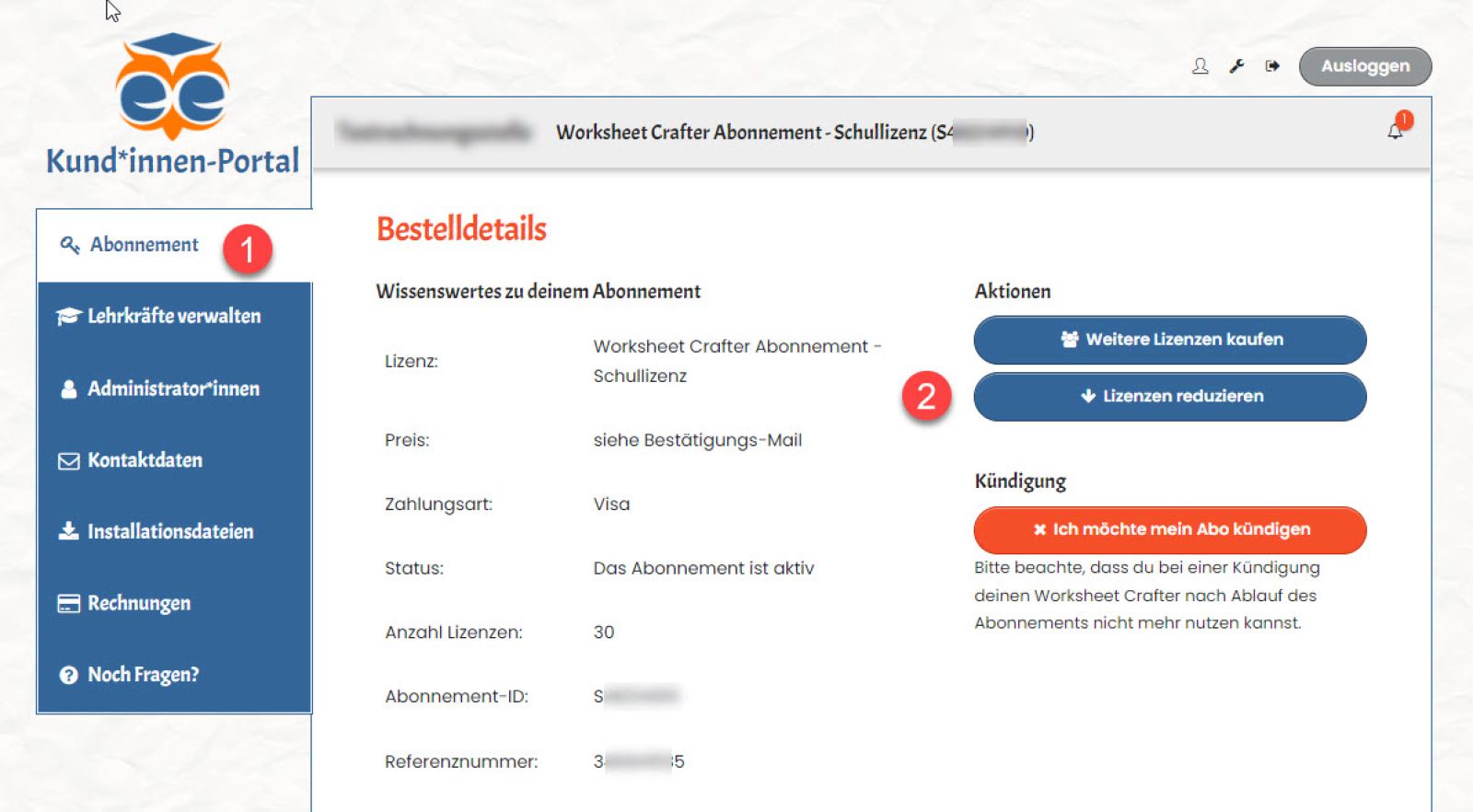 Schritt 1: Melde dich im Kund*innen-Portal an. Du musst dazu entweder "Besitzer*in" des "Abonnements für Schulen" sein (i.d.R. die Liefermailadresse) sein oder über das volle Adminrecht verfügen. Dann hast du im Kund*innen-Portal im Menü "Abonnement" die Option "Lizenzen reduzieren".