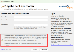 Der Worksheet Crafter bietet seit Version 2020.1 unter Windows zwei Möglichkeiten zur Speicherung der Lizenzdaten. Wenn du das Programm startest, und der Worksheet Crafter nach den Lizenzdaten fragt, wird am unteren Rand des Fensters die Art der Datenspeicherung beschrieben: