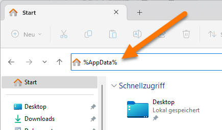 Klicke dann in die Pfad-Leiste und tippe dort %AppData% ein.