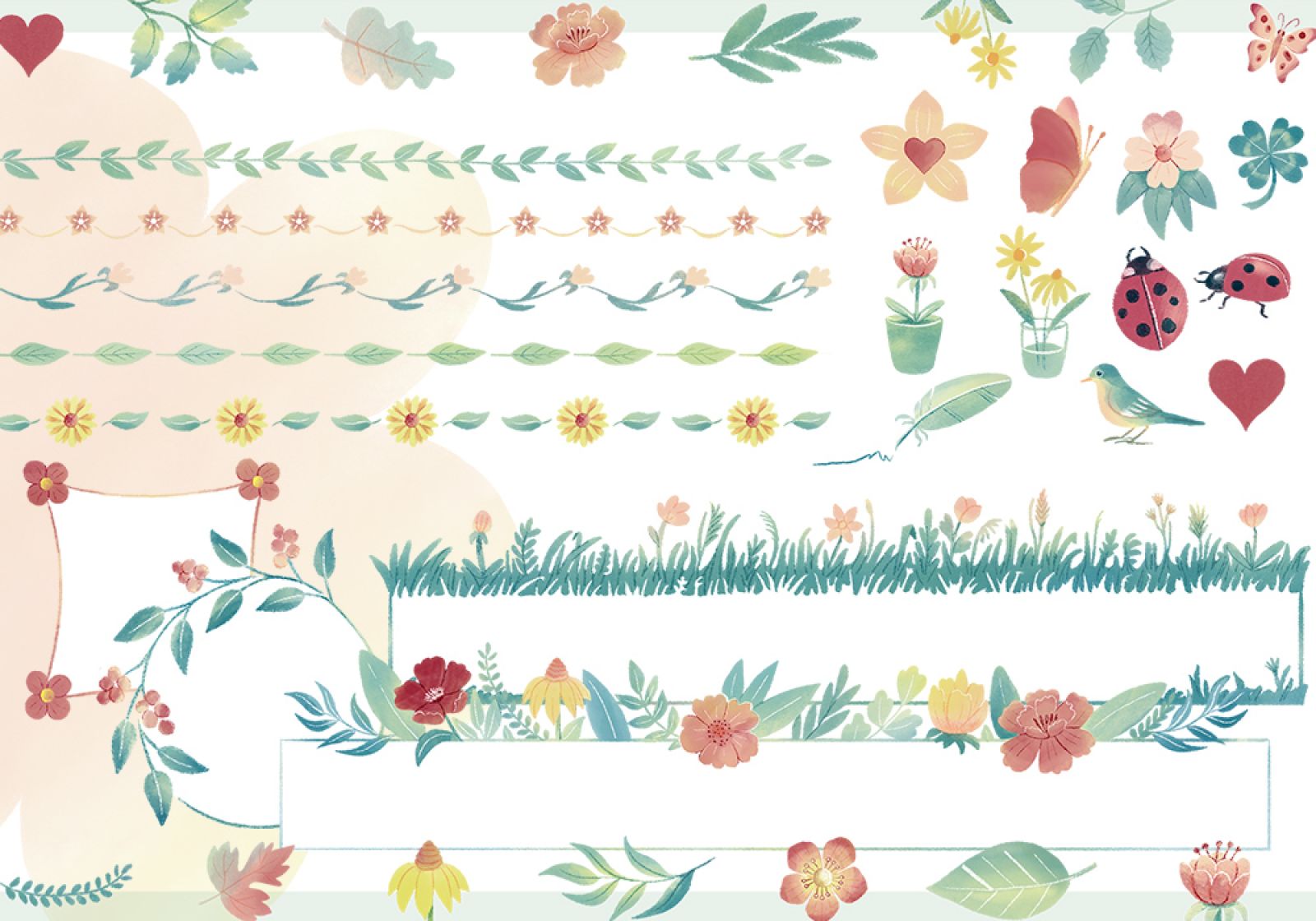 Zusätzlich zu den neuen Funktionen hat unsere Redaktion noch drei neue Kreativ-Pakete gezaubert. Jedes Paket enthält viele handgezeichnete Illustrationen rund um die Themen Technik, Schule und Floral.